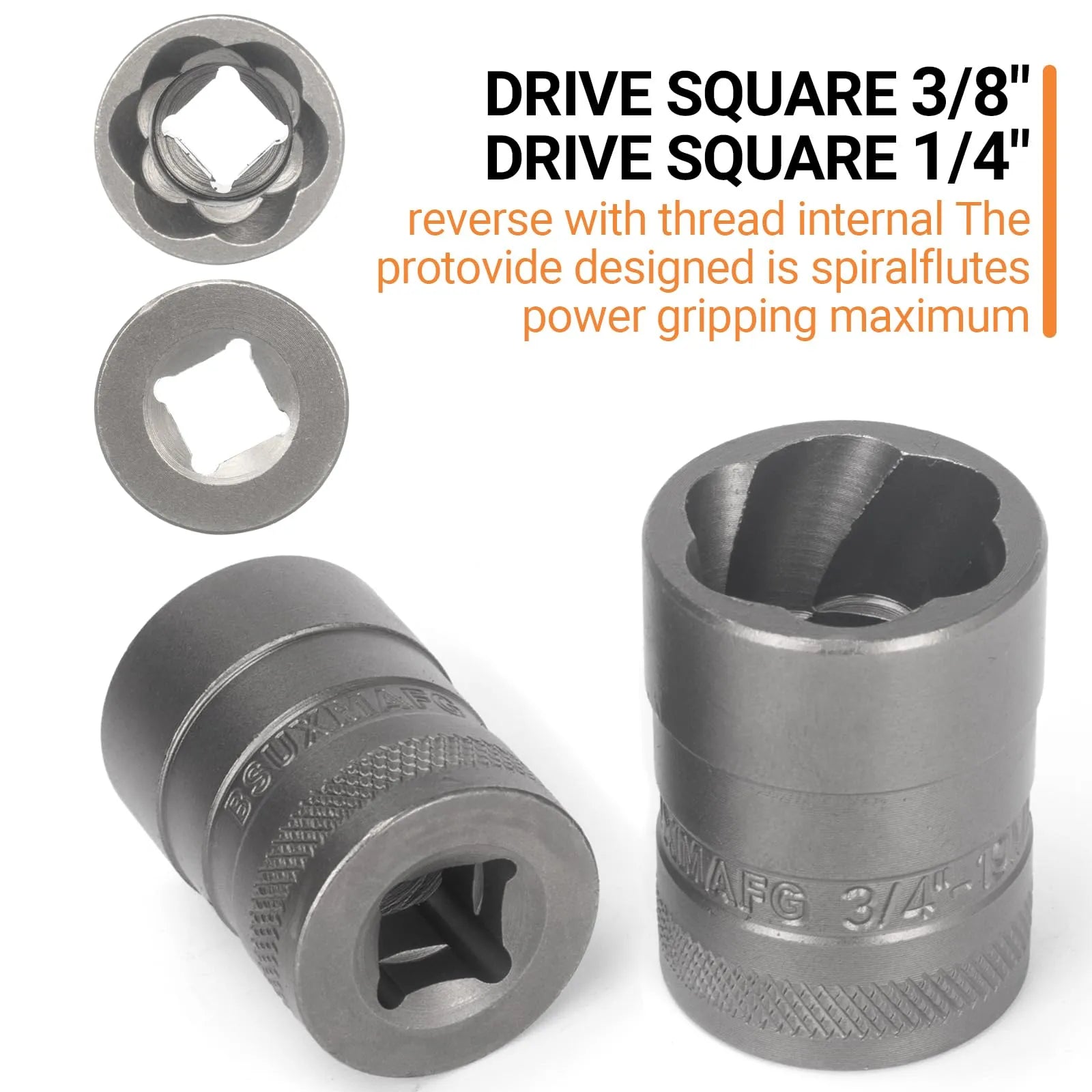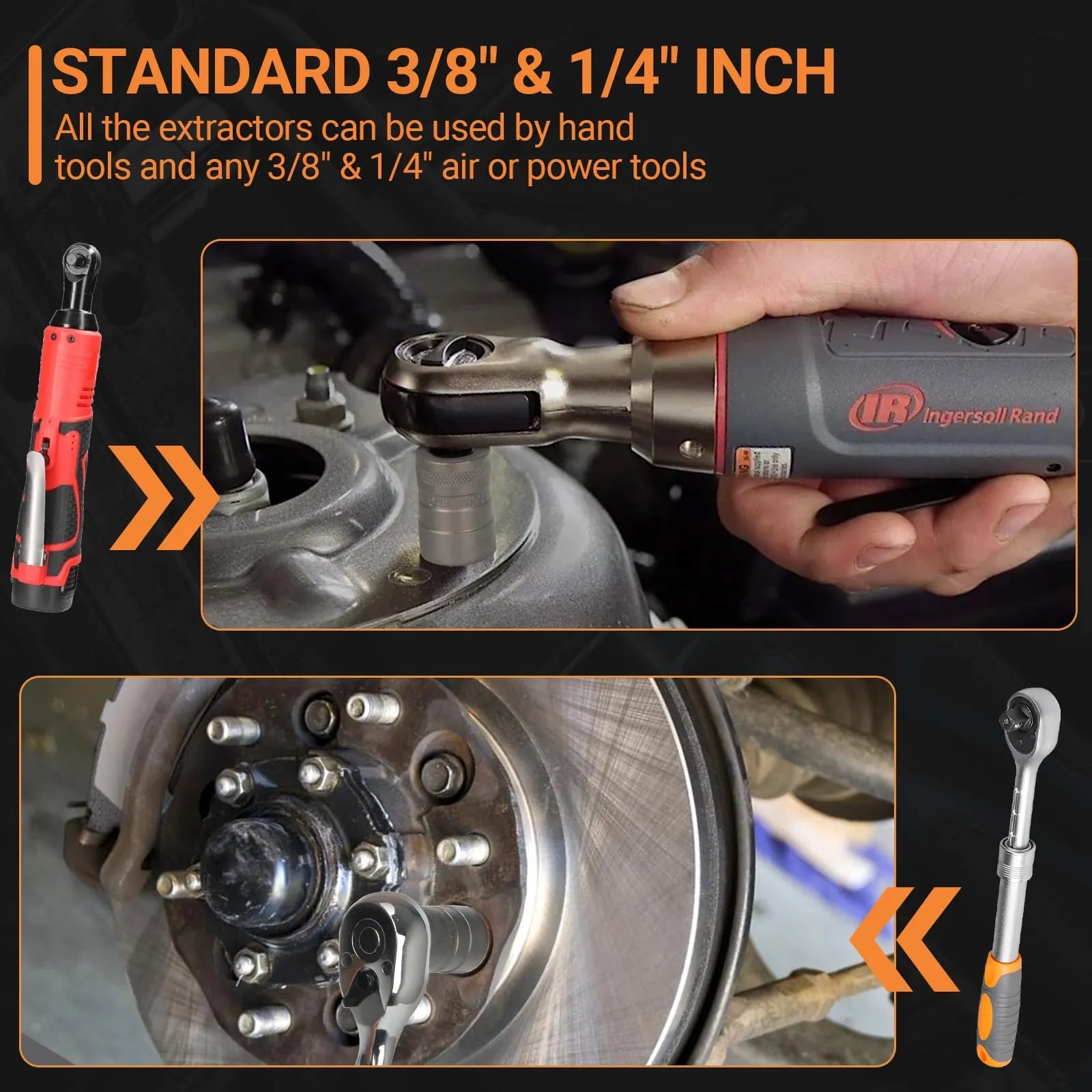 - Multipurpose: The bolt nut extractor set available in SAE (Inch) and Metric (mm) Sizes: 3/8" Drive 13pcs lug nut extractors Set: 13mm, 9/16"(14mm), 5/8"(16mm), 17mm, 11/16", 3/4"(19mm), 1/4", 5/16"(8mm), 3/8", 10mm, 7/16"(11mm), 12mm, 1/2". 1/4" Drive 16pcs stud extractors Set: 8mm, 8.2mm, 8.5mm, 8.7mm, 9mm, 9.2mm, 9.5mm, 10mm, 6mm, 6.2mm, 6.5mm, 6.7mm, 7mm, 7.2mm, 7.5mm, 7.7mm. Additional equipment is an easy out 1/4" & 3/8" hex adapter, plus a knockout rod.