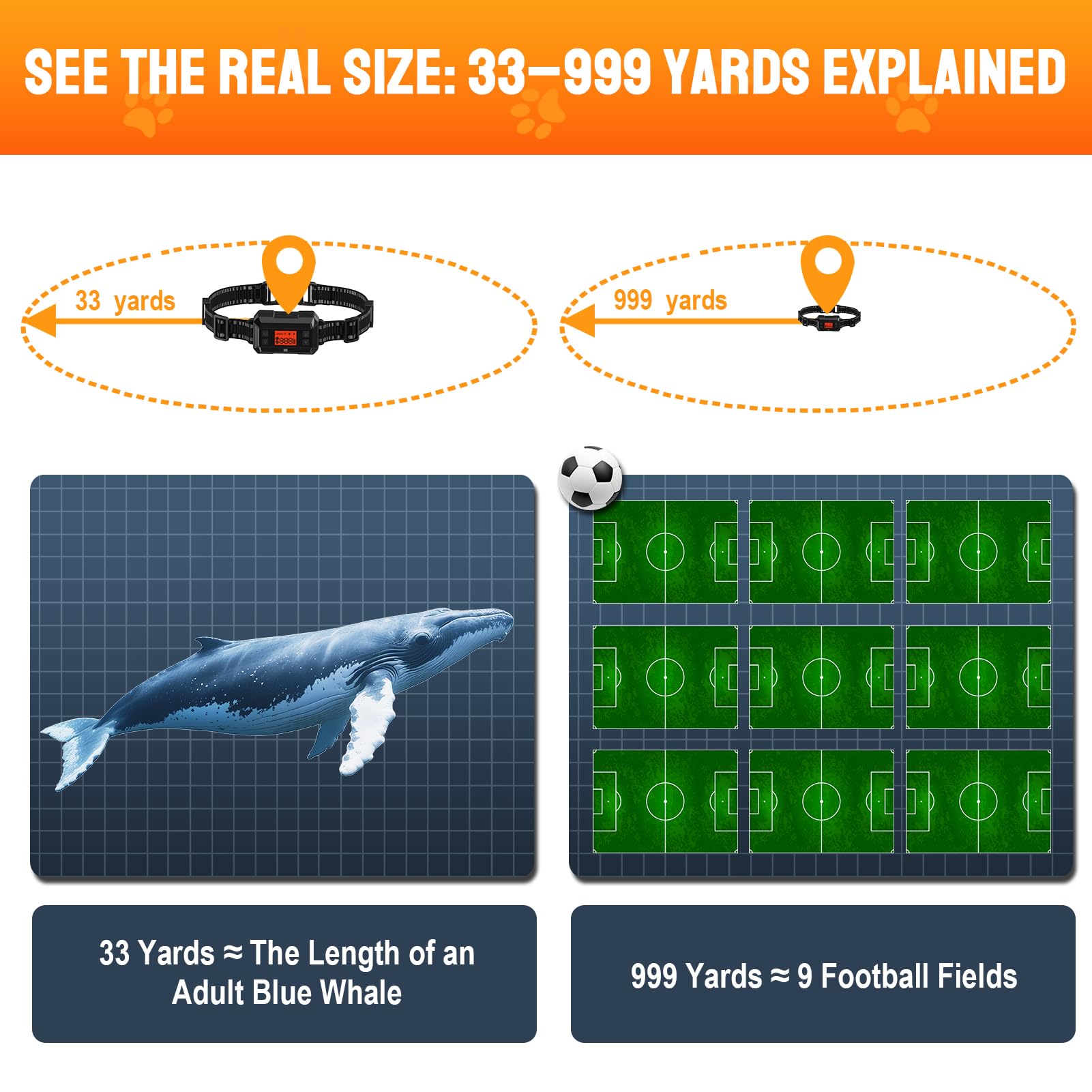 【Adjustable Range from 33 to 999 Yard】Customize your dog’s safe zone with a flexible range between 33yard and 999yard. Ideal for indoor use and outdoor wireless dog fence solutions for your yard