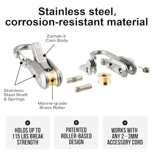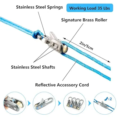 - High-Quality, rope rollers 6 pack paracord: The rope rolIers is constructed with marine-grade brass rolIers, stainless steel springs and shafts, and rust-resistant cams. this rope tensioner withstands sun, rain, and saltwater. Ideal for harsh outdoor conditions, it’s built stronger than plastic alternatives, ensuring long-term reliable use for camping, hiking, sailing, and more.