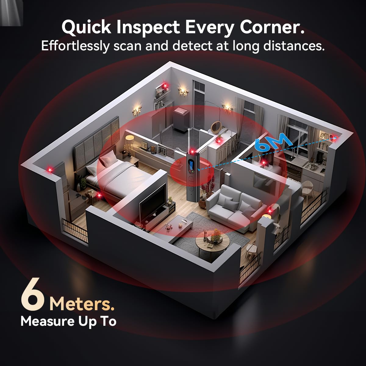 - [No Camera Can Hide]: The upgraded detector now supports a broader detection spectrum to enhance anti-interference capability. With 5 adjustable sensitivity levels, it helps locate suspicious devices within a 30-square-meter area. Choose between two working modes: Audible Alert and Vibration for effective detection in different environments.