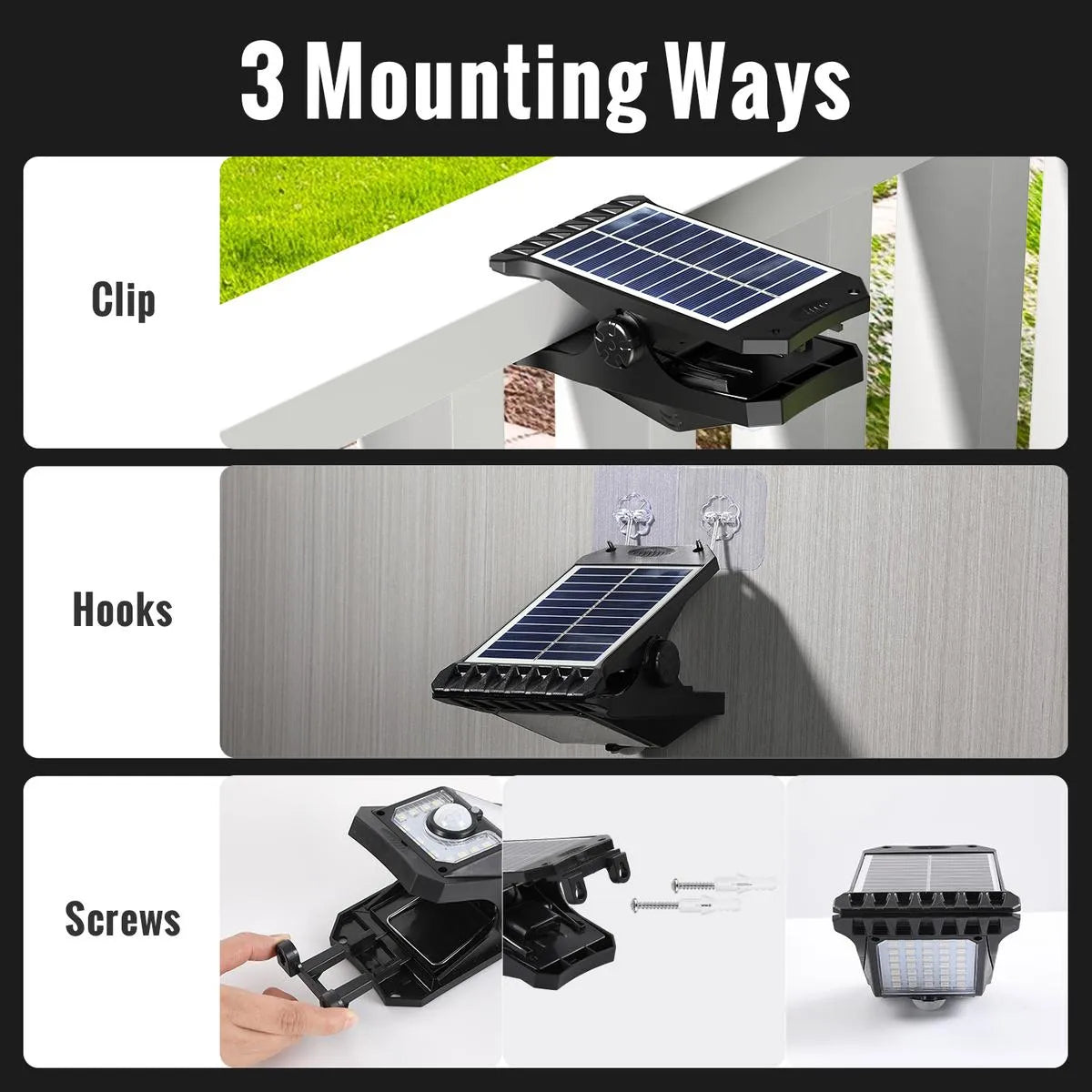 - Flexible Installation Ways: Solar motion sensor lights are designed in practical shape of a clip,You can easily clip on or move them anywhere outdoors according to your own preferences.You can also install the solar lights with screws or transparent hooks (package don’t provide screws/hooks),For optimal performance, recommend height: 4.92ft - 8.2ft.